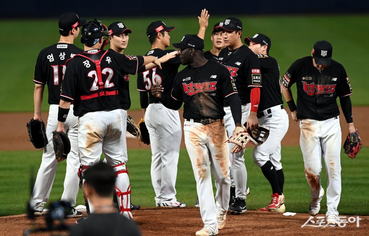 3일 창원NC파크에서 ‘2023 신한은행 SOL KBO리그’ NC 다이노스와 kt 위즈의 플레이오프 4차전 경기가 열렸다. kt가 NC를 상대로 11-2 승리를 거두며 2연패 후 2연승을 기록한 뒤 선수들이 그라운드에서 기쁨을 나누고 있다.