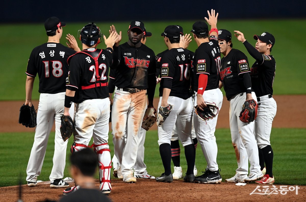 3일 창원NC파크에서 ‘2023 신한은행 SOL KBO리그’ NC 다이노스와 kt 위즈의 플레이오프 4차전 경기가 열렸다. kt가 NC를 상대로 11-2 승리를 거두며 2연패 후 2연승을 기록한 뒤 선수들이 그라운드에서 기쁨을 나누고 있다.