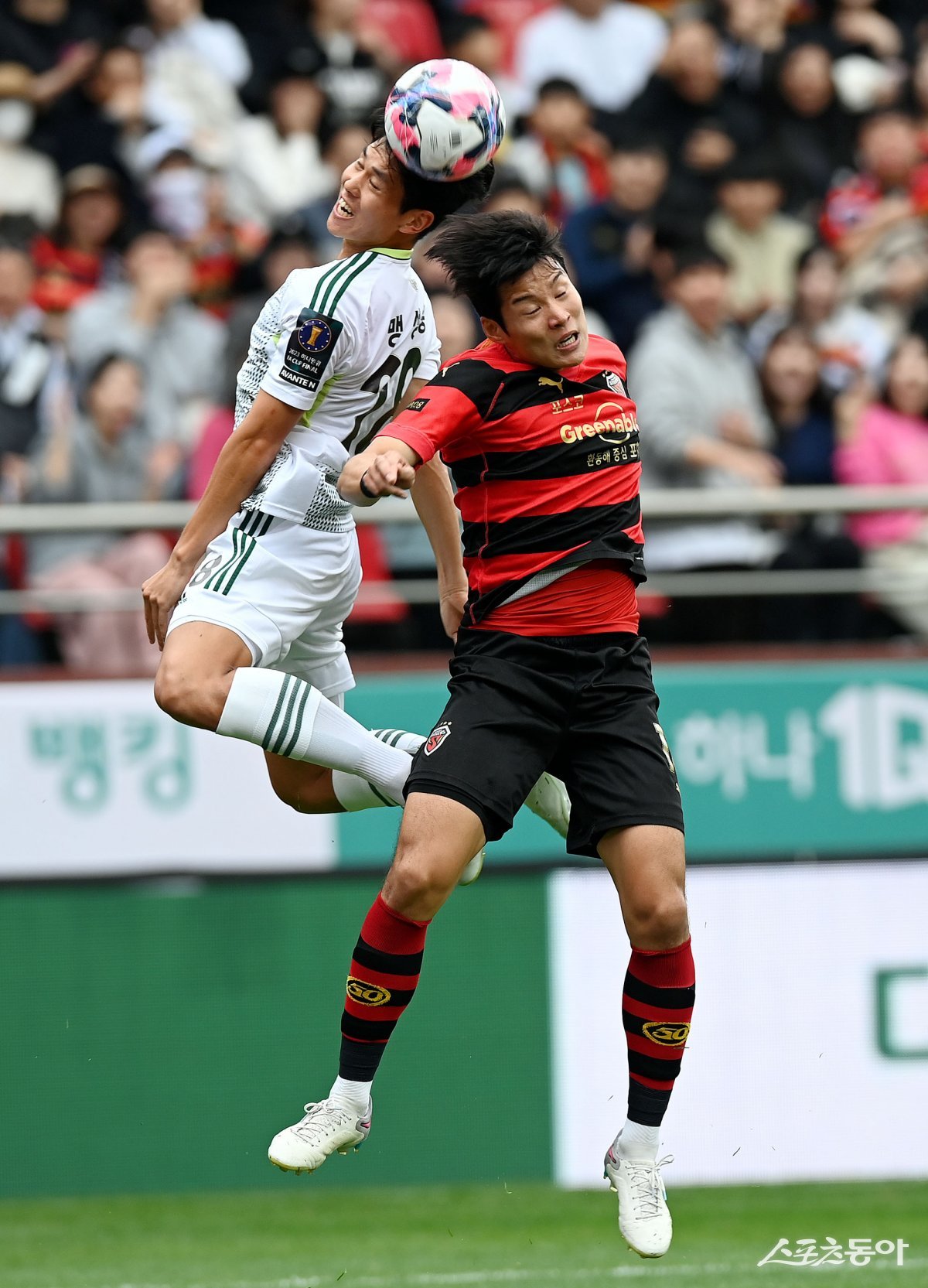4일 경북 포항스틸야드에서 열린 ‘2023 하나원큐 FA CUP’ 포항 스틸러스와 전북 현대의 결승 경기에서 전북 맹성웅과 포항 박승욱이 공중볼을 다투고 있다.