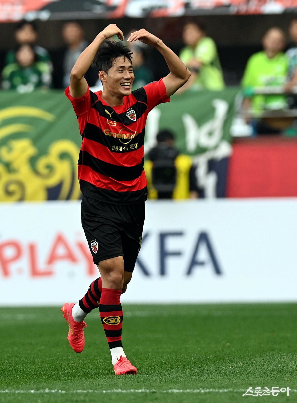 4일 경북 포항스틸야드에서 열린 ‘2023 하나원큐 FA CUP’ 포항 스틸러스와 전북 현대의 결승 경기에서 포항 한찬희가 동점골을 넣은 후 환호하고 있다.