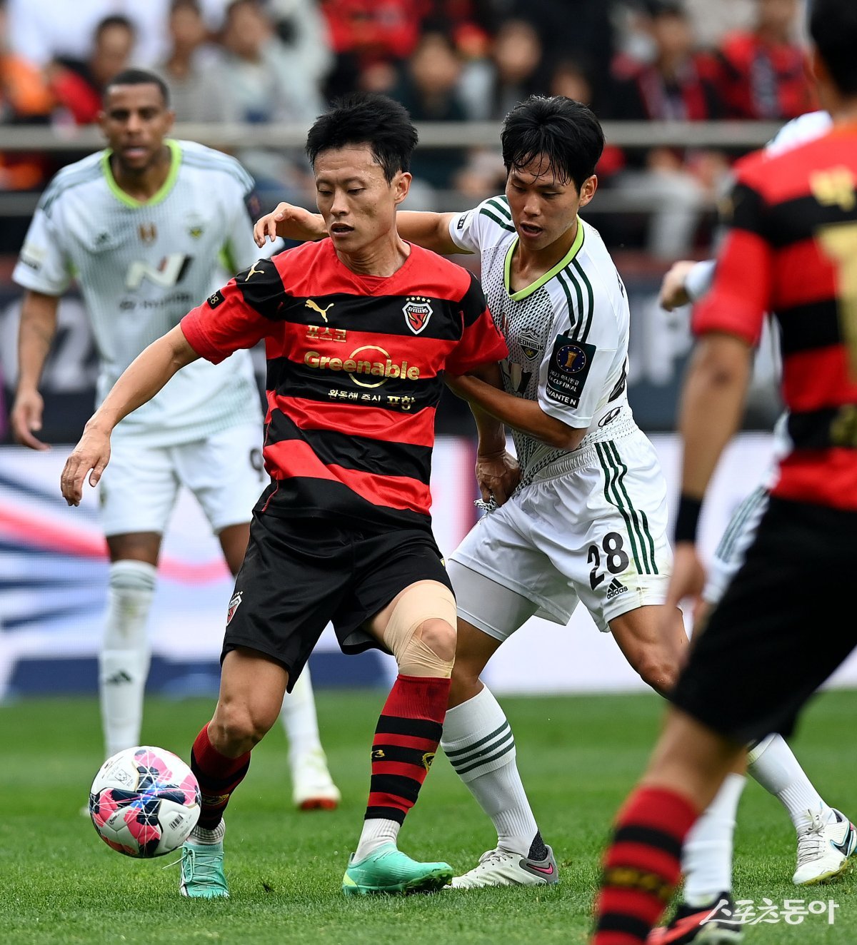 4일 경북 포항스틸야드에서 열린 ‘2023 하나원큐 FA CUP’ 포항 스틸러스와 전북 현대의 결승 경기에서 포항 김종우와 전북 맹성웅이 볼 다툼을 벌이고 있다.