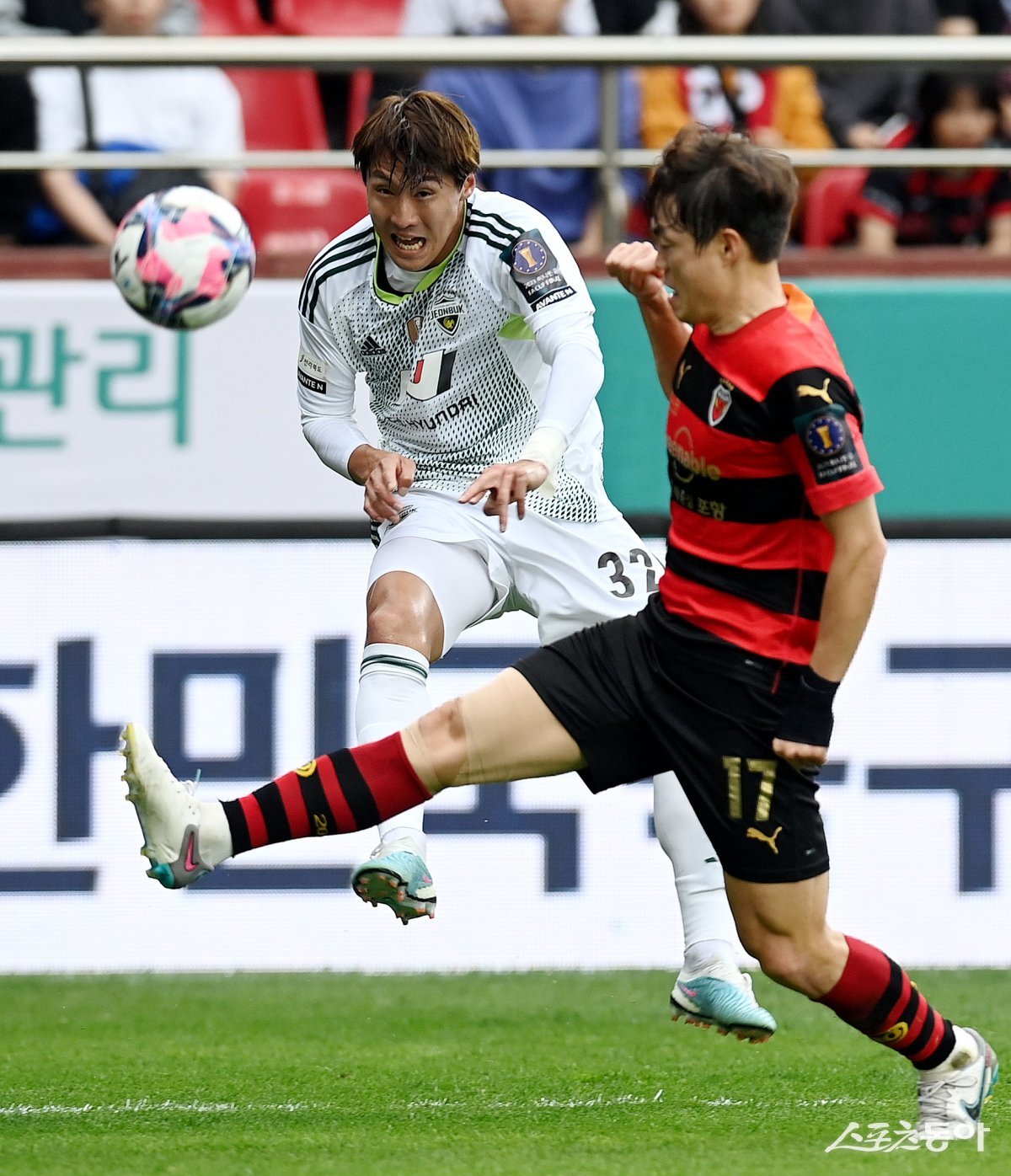 4일 경북 포항스틸야드에서 열린 ‘2023 하나원큐 FA CUP’ 포항 스틸러스와 전북 현대의 결승 경기에서 전북 정우재가 포항 수비를 피해 패스를 시도하고 있다.