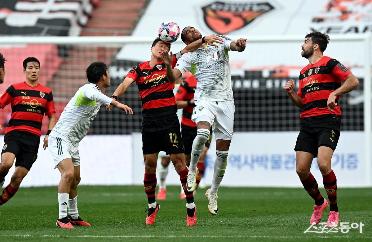 4일 경북 포항스틸야드에서 열린 ‘2023 하나원큐 FA CUP’ 포항 스틸러스와 전북 현대의 결승 경기에서 전북 구스타보와 포항 김승대가 공중볼을 다투고 있다.