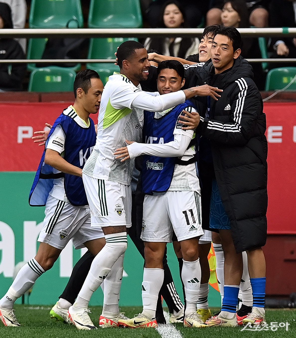4일 경북 포항스틸야드에서 열린 ‘2023 하나원큐 FA CUP’ 포항 스틸러스와 전북 현대의 결승 경기에서 전북 구스타보가 페널티킥을 성공한 후 동료들과 기쁨을 나누고 있다.