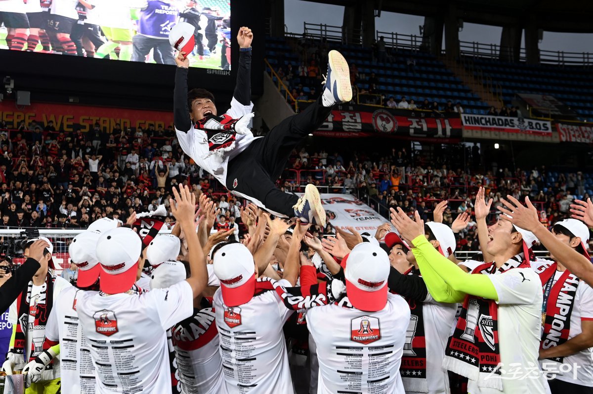 4일 경북 포항스틸야드에서 열린 ‘2023 하나원큐 FA CUP’ 포항 스틸러스와 전북 현대의 결승 경기에서 포항이 우승을 차지한 후 김기동 감독이 헹가래 세리머니를 받고 있다. 포항 | 김민성 기자 marineboy@donga.com