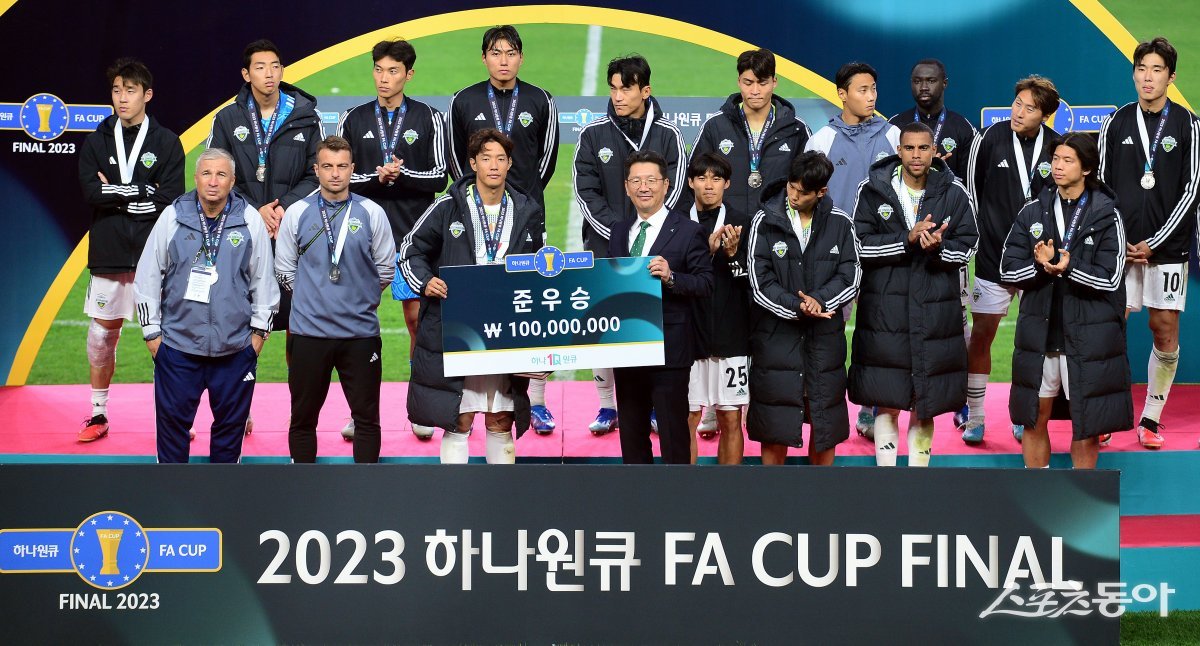 4일 경북 포항스틸야드에서 열린 ‘2023 하나원큐 FA CUP’ 포항 스틸러스와 전북 현대의 결승 경기에서 전북이 준우승을 차지한 후 기념촬영을 하고 있다. 포항 | 김민성 기자 marineboy@donga.com