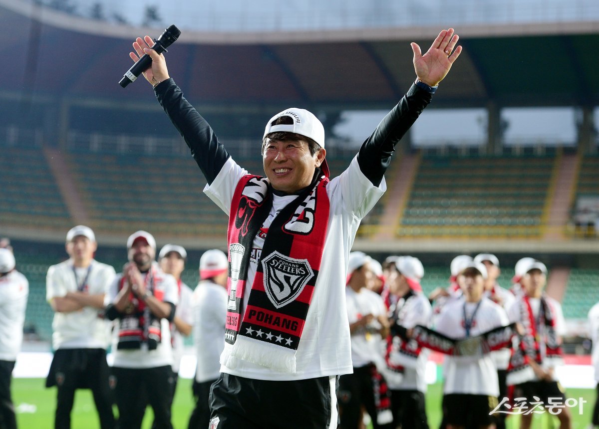 4일 경북 포항스틸야드에서 열린 ‘2023 하나원큐 FA CUP’ 포항 스틸러스와 전북 현대의 결승 경기에서 포항이 우승을 차지한 후 김기동 감독이 환호하고 있다. 포항 | 김민성 기자 marineboy@donga.com