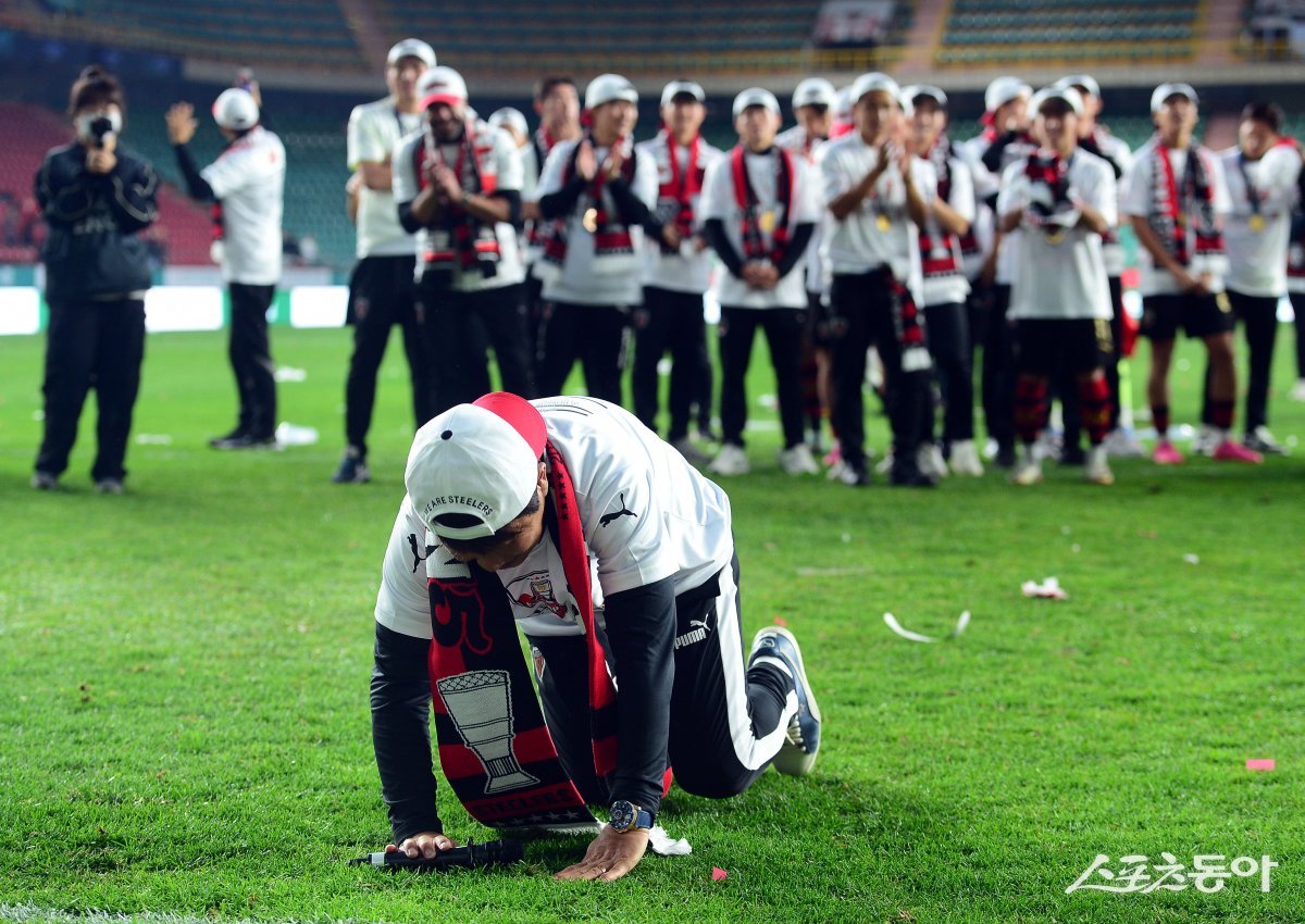 4일 경북 포항스틸야드에서 열린 ‘2023 하나원큐 FA CUP’ 포항 스틸러스와 전북 현대의 결승 경기에서 포항이 우승을 차지한 후 김기동 감독이 팬들에게 절을 하고 있다. 포항 | 김민성 기자 marineboy@donga.com
