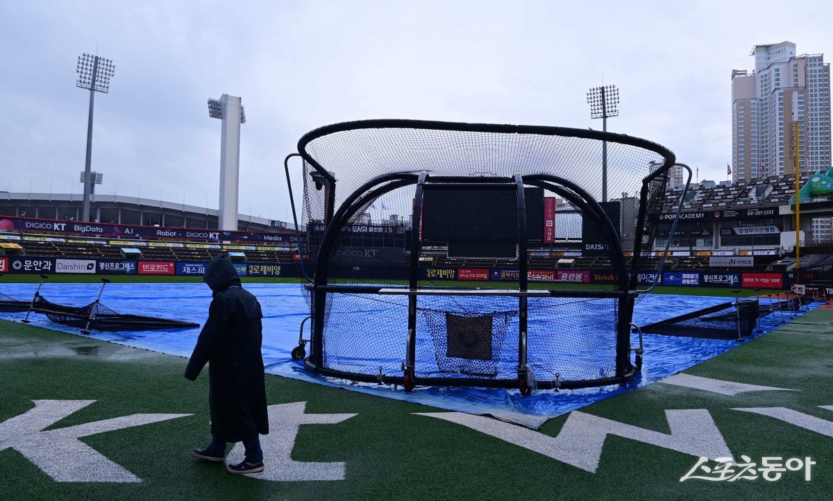 5일 경기도 수원KT위즈파크에서 열린 ‘2023 KBO 포스트시즌’ KT 위즈와 NC 다이노스의 플레이오프 5차전 경기에 비가 내리고 있다. 수원 | 주현희 기자 teth1147@donga.com