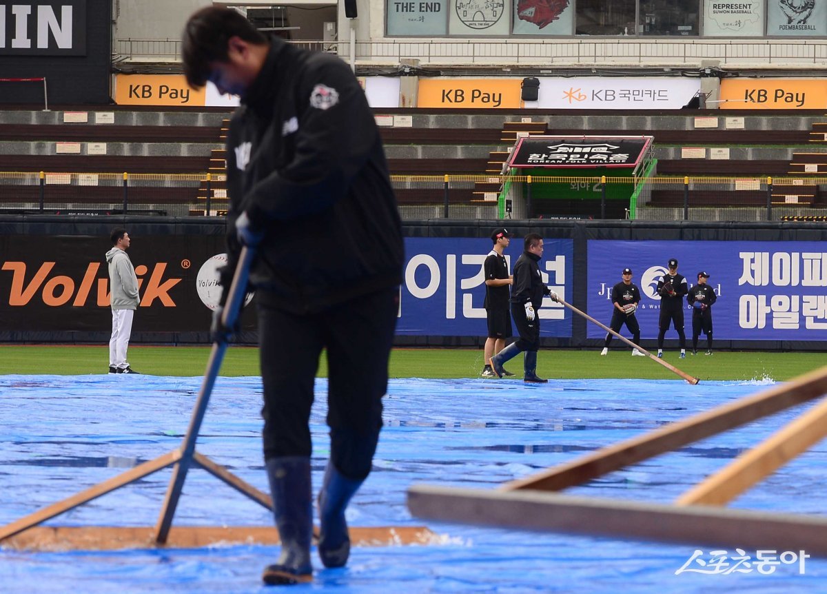 5일 경기도 수원KT위즈파크에서 열린 ‘2023 KBO 포스트시즌’ KT 위즈와 NC 다이노스의 플레이오프 5차전 경기에 앞서 KT 선수들이 외야에서 몸을 풀고 있다. 수원 | 주현희 기자 teth1147@donga.com
