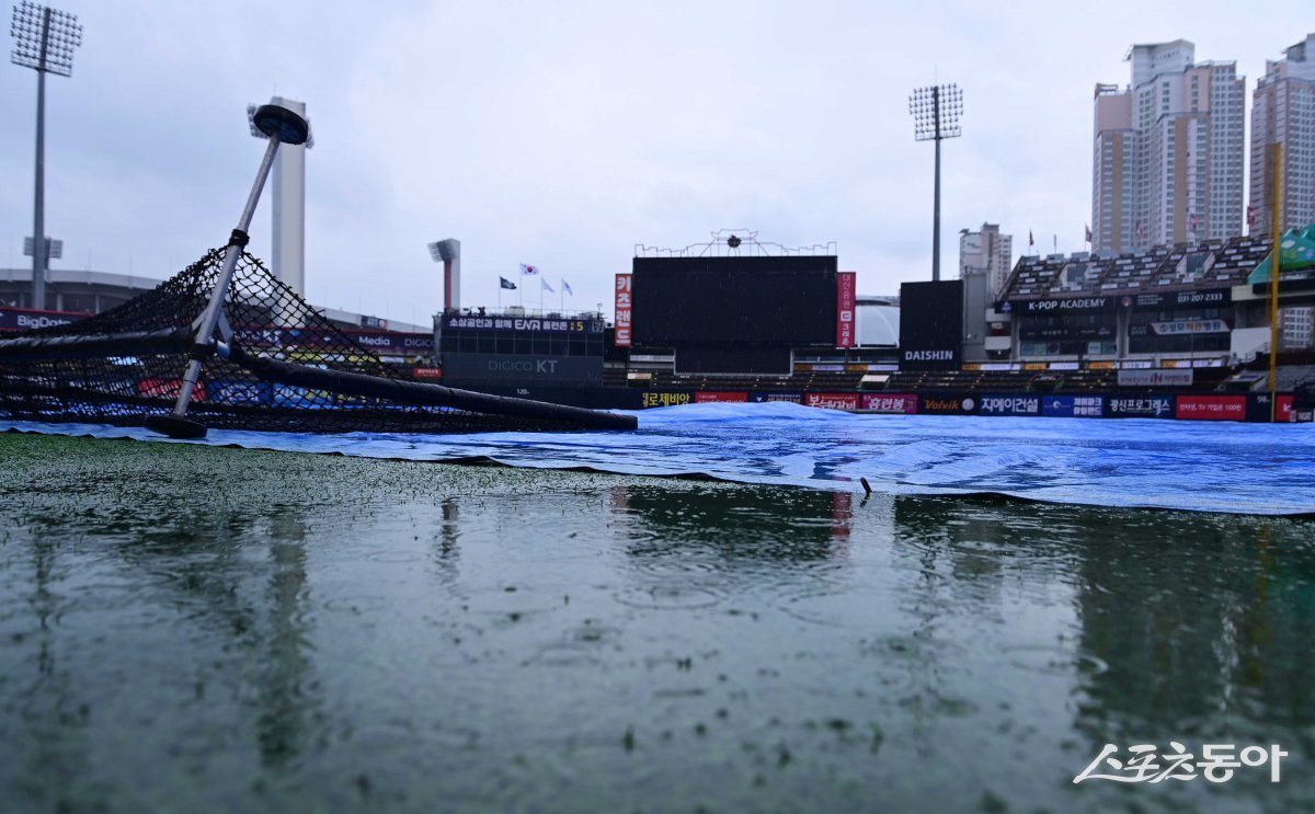 5일 경기도 수원KT위즈파크에서 열린 ‘2023 KBO 포스트시즌’ KT 위즈와 NC 다이노스의 플레이오프 5차전 경기에 비가 내리고 있다. 수원 | 주현희 기자 teth1147@donga.com