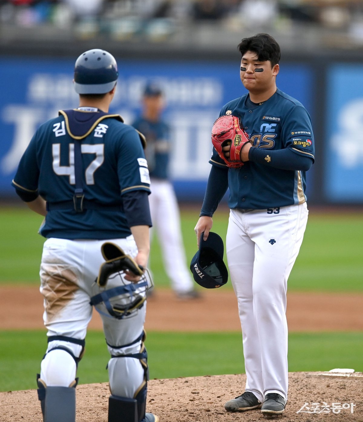 5일 수원KT위즈파크에서 ‘2023 KBO 포스트시즌’ KT 위즈와 NC 다이노스의 플레이오프 5차전 경기가 열렸다. 선발 투수로 등판한 NC 신민혁이 5회말 1사 2루상황에서 교체되고 있다.