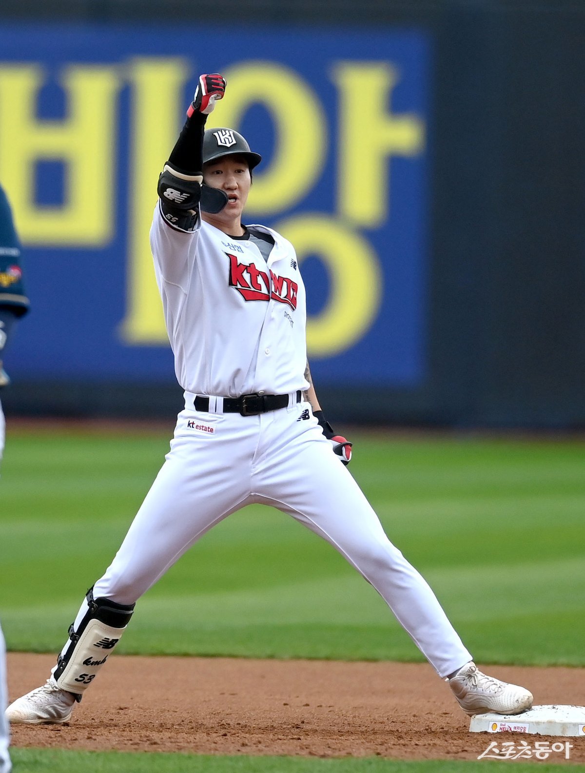 5일 수원KT위즈파크에서 ‘2023 KBO 포스트시즌’ KT 위즈와 NC 다이노스의 플레이오프 5차전 경기가 열렸다. 5회말 1사 1,3루 KT 김민혁이 동점을 만드는 2타점 우전 2루타를 치고 2루에서 기뻐하고 있다.