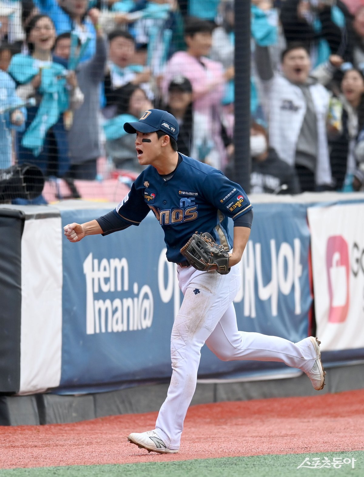 5일 수원KT위즈파크에서 ‘2023 KBO 포스트시즌’ KT 위즈와 NC 다이노스의 플레이오프 5차전 경기가 열렸다. 4회말 2사 NC 서호철이 직선타를 호수비 한 후 기뻐하고 있다.