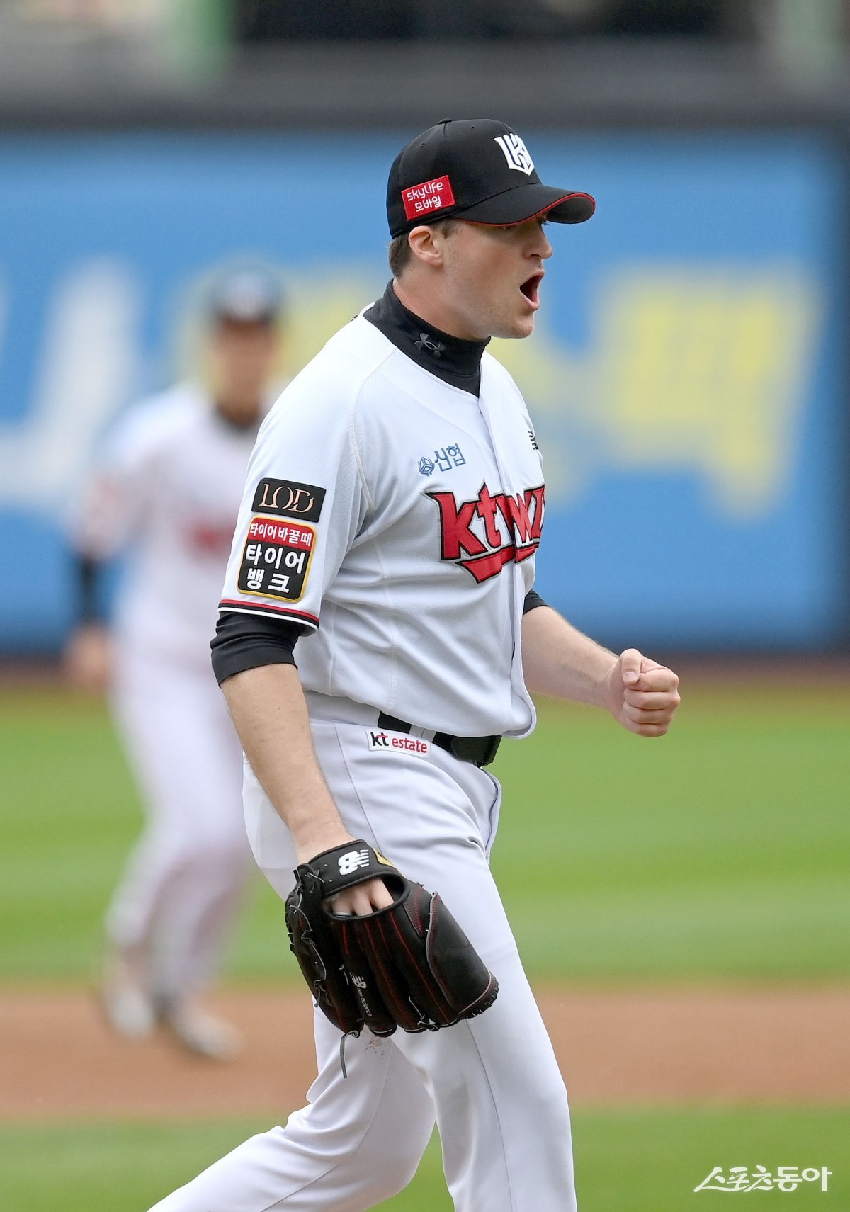 5일 수원KT위즈파크에서 ‘2023 KBO 포스트시즌’ KT 위즈와 NC 다이노스의 플레이오프 5차전 경기가 열렸다. 선발 투수로 등판한 KT 벤자민이 3회초 2사 1,3루 상황에서 삼진으로 이닝을 종료시킨 후 환호하고 있다.