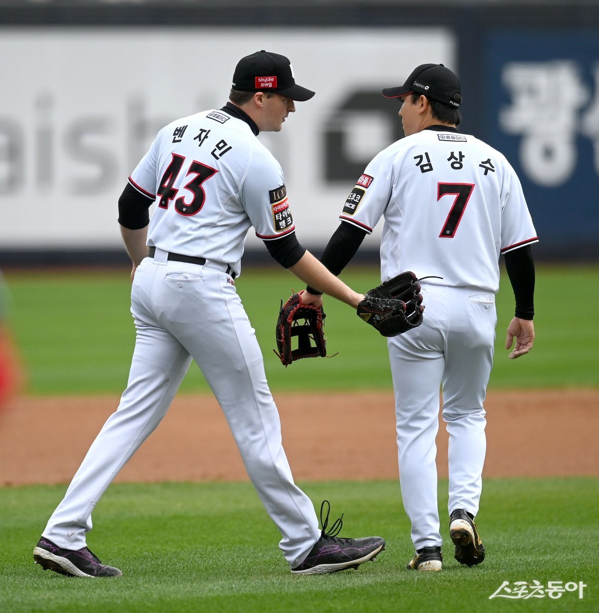 5일 수원KT위즈파크에서 ‘2023 KBO 포스트시즌’ KT 위즈와 NC 다이노스의 플레이오프 5차전 경기가 열렸다. 3회초 1사 KT 김상수가 연속 포구 실책을 범하자 벤자민이 위로하고 있다.