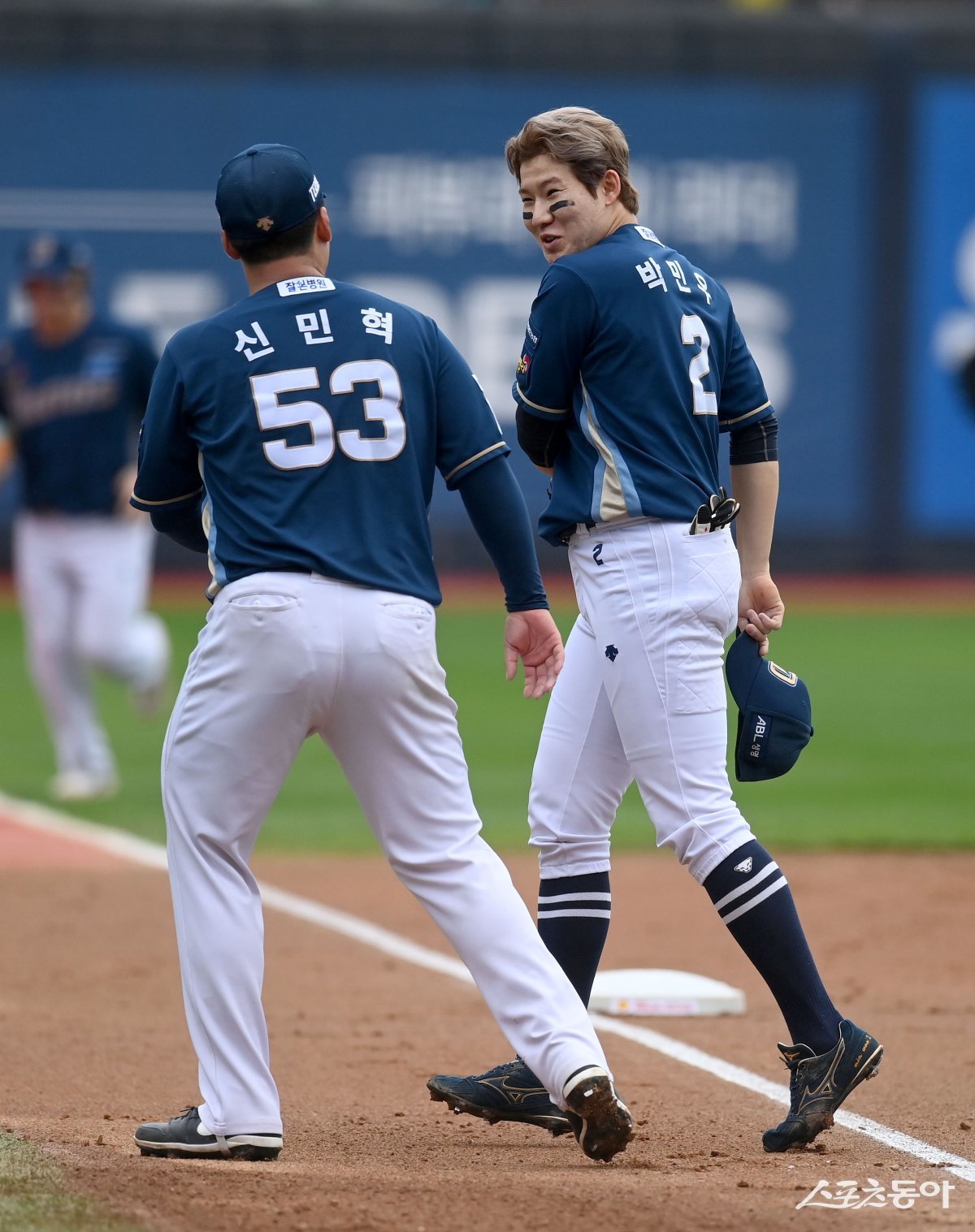 5일 수원KT위즈파크에서 ‘2023 KBO 포스트시즌’ KT 위즈와 NC 다이노스의 플레이오프 5차전 경기가 열렸다. 2회말 수비를 마친 NC 박민우가 신민혁과 이야기하고 있다.