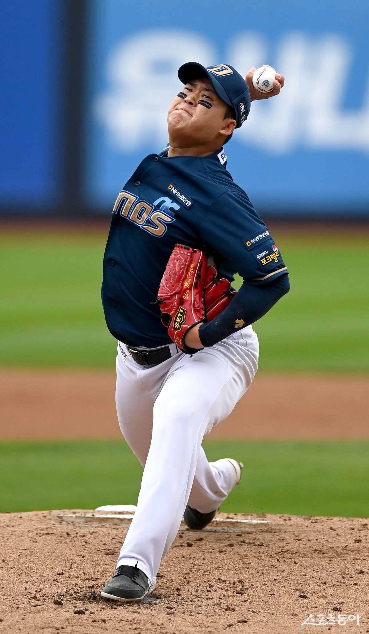 5일 수원KT위즈파크에서 ‘2023 KBO 포스트시즌’ KT 위즈와 NC 다이노스의 플레이오프 5차전 경기가 열렸다. 선발 투수로 등판한 NC 신민혁이 역투하고 있다.