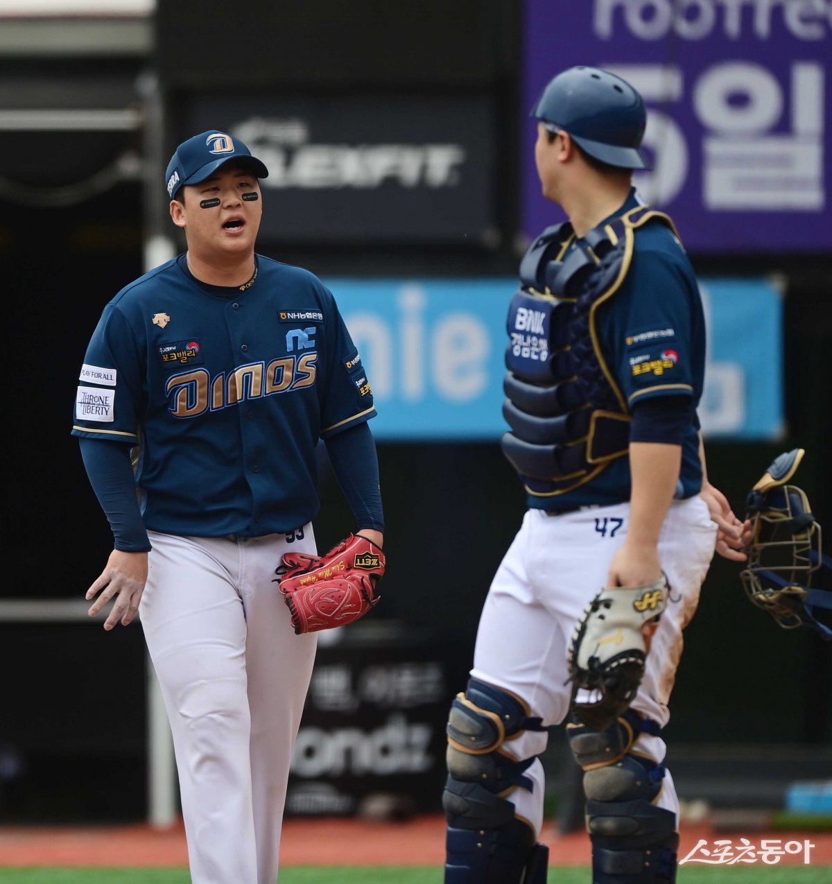 5일 경기도 수원KT위즈파크에서 열린 ‘2023 KBO 포스트시즌’ KT 위즈와 NC 다이노스의 플레이오프 5차전 경기에서 5회말 1사 2루 KT에 안타를 허용한 NC 신민혁이 아쉬워하고 있다.