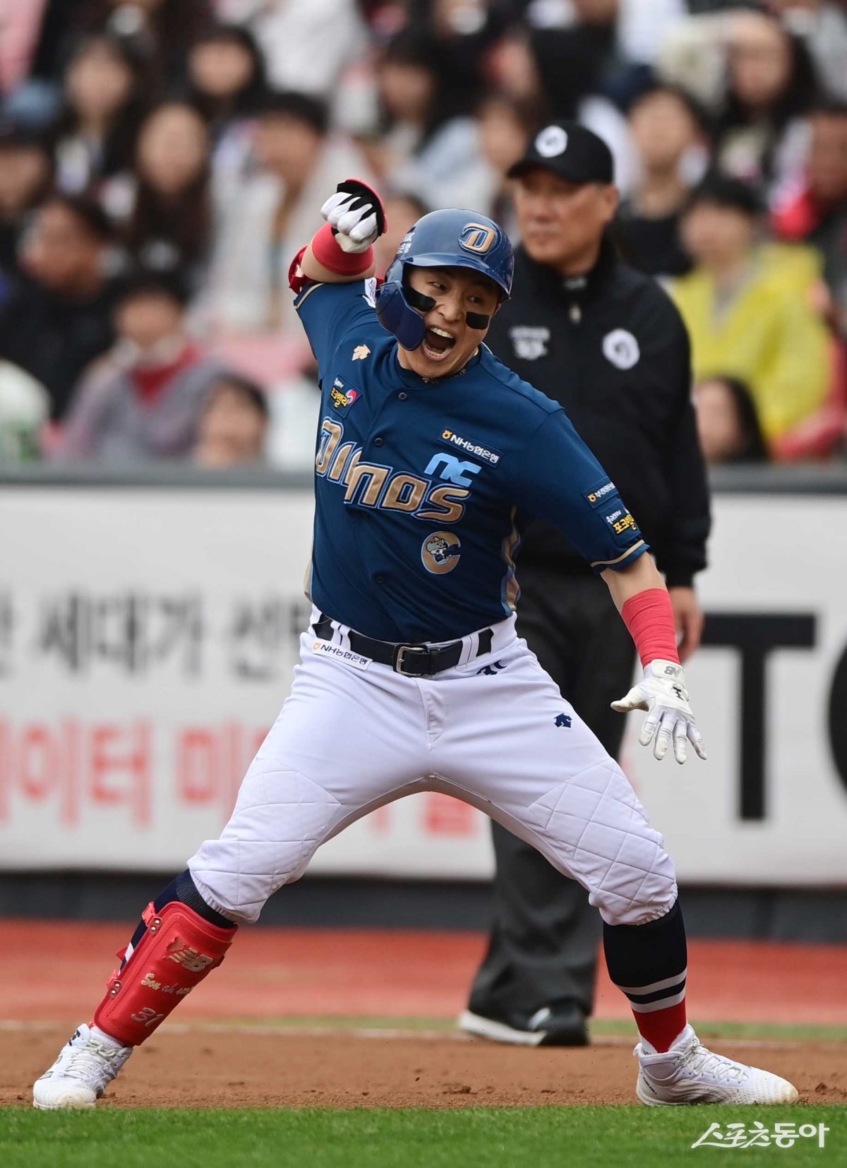 5일 경기도 수원KT위즈파크에서 열린 ‘2023 KBO 포스트시즌’ KT 위즈와 NC 다이노스의 플레이오프 5차전 경기에서 5회초 1사 3루 NC 손아섭이 1타점 중전 적시타를 친 후 세리머니를 하고 있다.