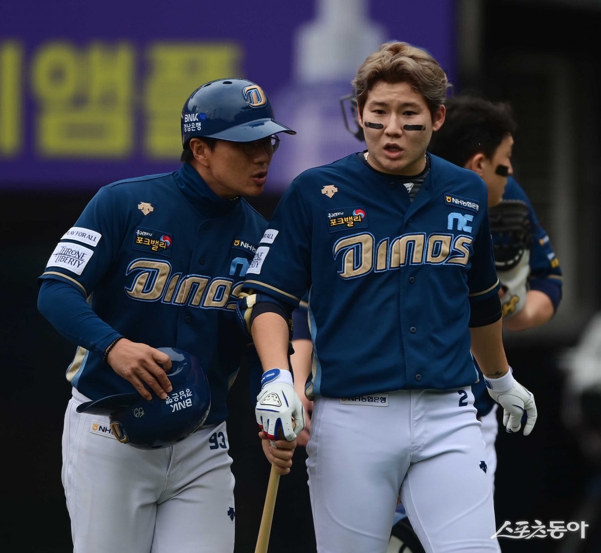 5일 경기도 수원KT위즈파크에서 열린 ‘2023 KBO 포스트시즌’ KT 위즈와 NC 다이노스의 플레이오프 5차전 경기에서 3회초 2사 1, 3루 NC 박민우가 삼진 아웃을 당한 후 아쉬워하고 있다.