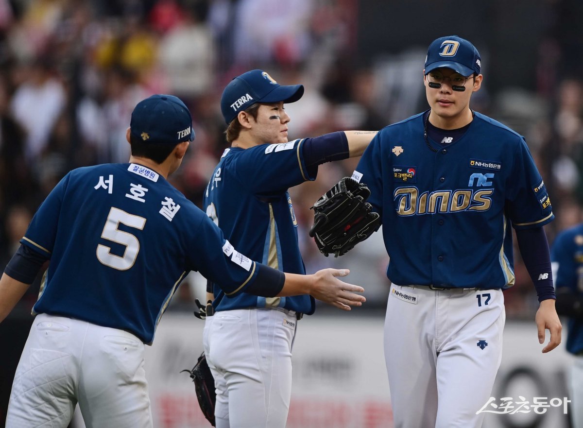 5일 경기도 수원KT위즈파크에서 열린 ‘2023 KBO 포스트시즌’ KT 위즈와 NC 다이노스의 플레이오프 5차전 경기에서 6회말 무사 1루 상황에서 NC 김영규가 마운드를 내려가고 있다.