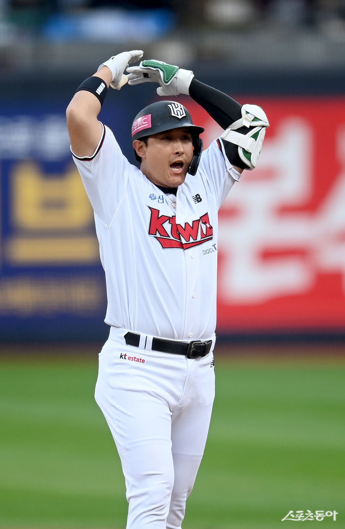 5일 수원KT위즈파크에서 ‘2023 KBO 포스트시즌’ KT 위즈와 NC 다이노스의 플레이오프 5차전 경기가 열렸다. 6회말 무사 1루 KT 황재균이 우전 안타를 치고 1루에서 기뻐하고 있다.