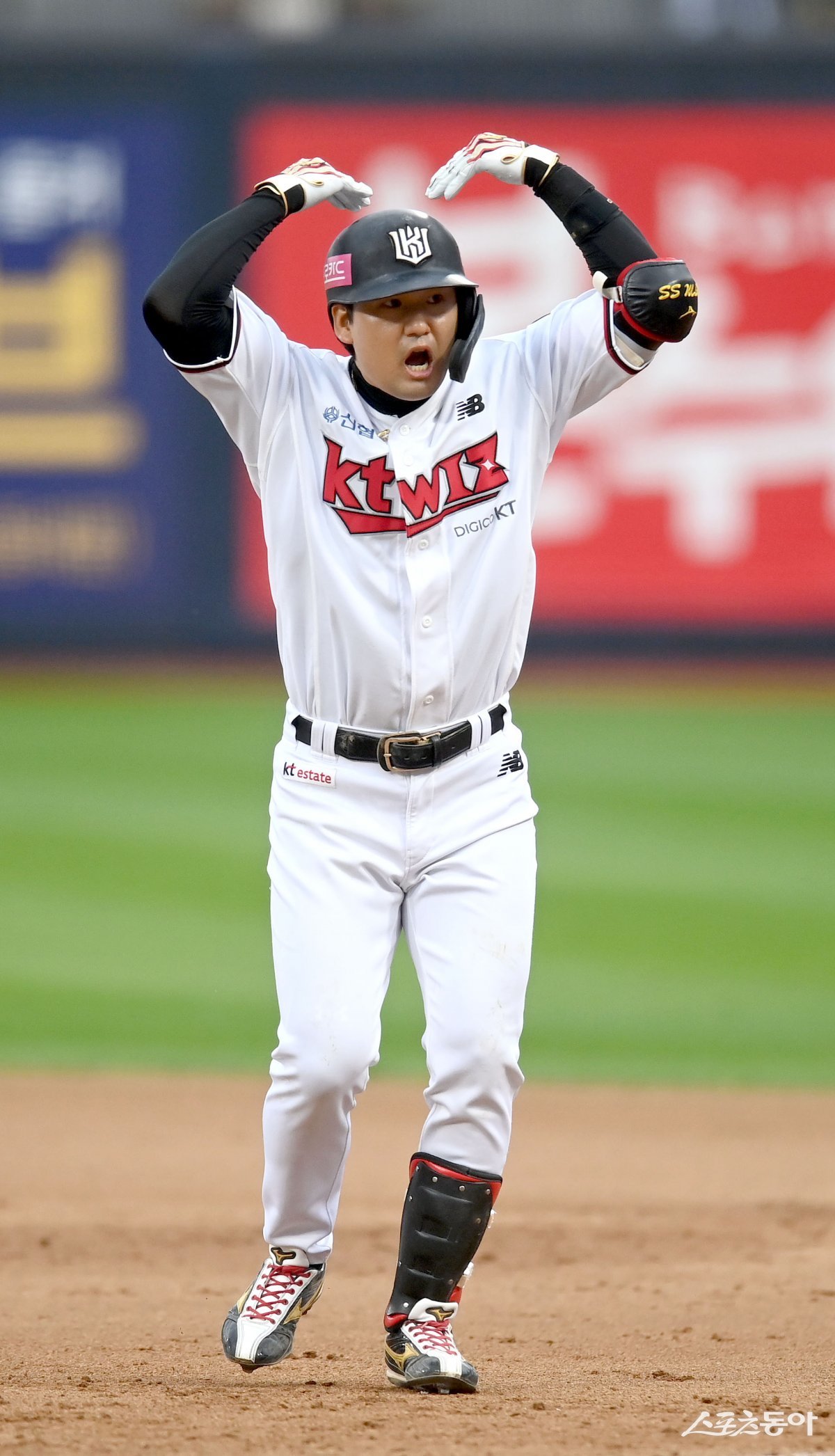 5일 수원KT위즈파크에서 ‘2023 KBO 포스트시즌’ KT 위즈와 NC 다이노스의 플레이오프 5차전 경기가 열렸다. 6회말 무사 KT 김상수가 우전 안타를 치고 1루에서 기뻐하고 있다.