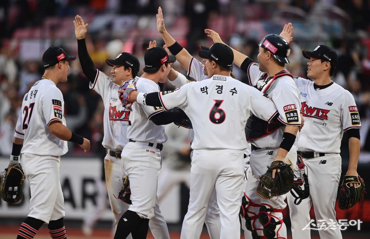 5일 경기도 수원KT위즈파크에서 열린 ‘2023 KBO 포스트시즌’ KT 위즈와 NC 다이노스의 플레이오프 5차전 경기에서 3-2로 승리하며 한국시리즈 진출을 확정지은 KT 선수들이 기쁨을 나누고 있다.