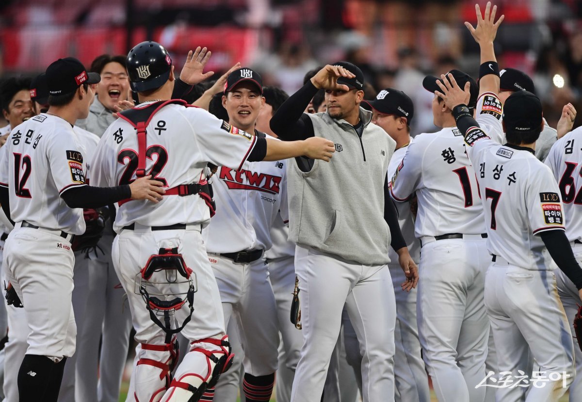 5일 경기도 수원KT위즈파크에서 열린 ‘2023 KBO 포스트시즌’ KT 위즈와 NC 다이노스의 플레이오프 5차전 경기에서 3-2로 승리하며 한국시리즈 진출을 확정지은 KT 선수들이 기쁨을 나누고 있다.