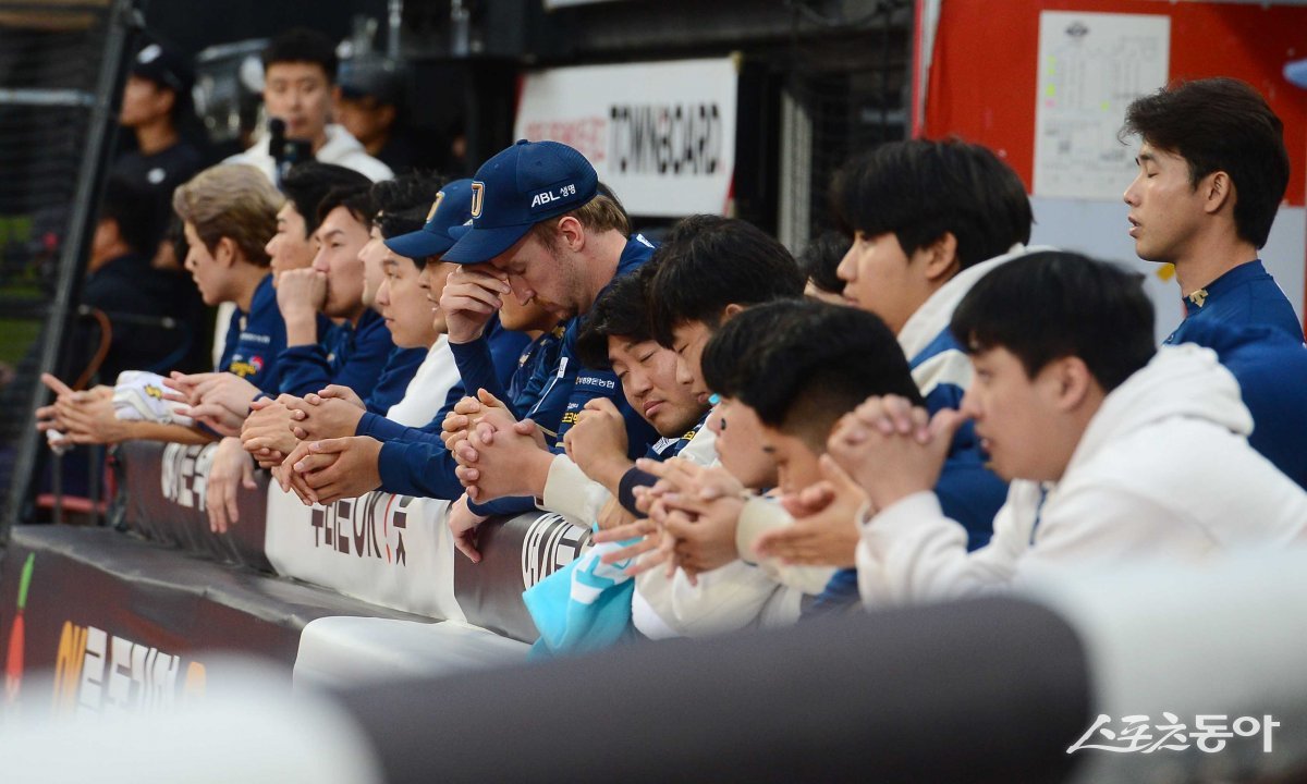 5일 경기도 수원KT위즈파크에서 열린 ‘2023 KBO 포스트시즌’ KT 위즈와 NC 다이노스의 플레이오프 5차전 경기에서 2-3으로 패하며 한국시리즈 진출이 좌절된 NC 선수들이 아쉬워하고 있다.