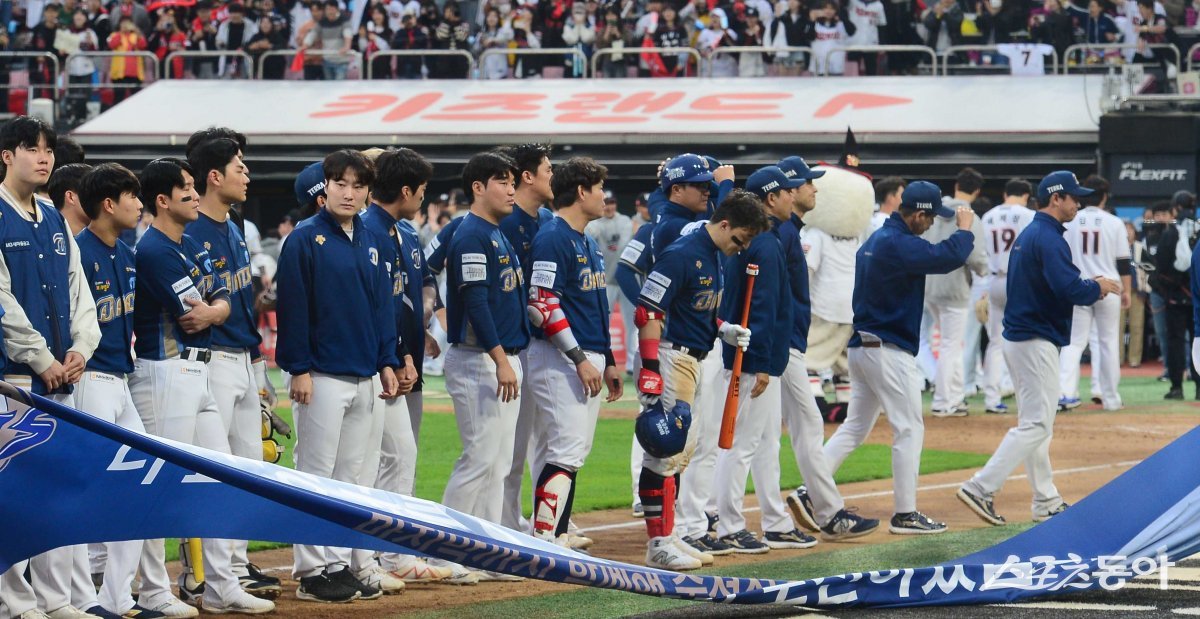 5일 경기도 수원KT위즈파크에서 열린 ‘2023 KBO 포스트시즌’ KT 위즈와 NC 다이노스의 플레이오프 5차전 경기에서 2-3으로 패하며 한국시리즈 진출이 좌절된 NC 선수들이 아쉬워하고 있다.