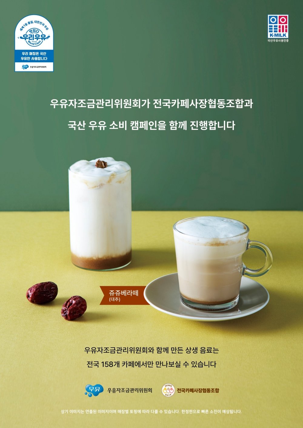 우유자조금관리위원회(위원장 이승호)가 전국카페사장협동조합(이사장 고장수)과 함께 2차 상생 음료인 ‘쥬쥬베라떼’를 내놓았다.