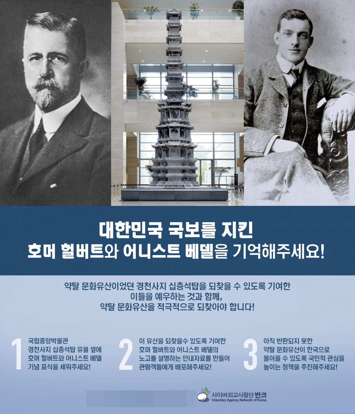 반크는 경천사지 십층석탑을 지킨 외국인 독립운동가들을 예우하고 약탈 문화유산의 반환이 적극적으로 이루어질 수 있도록, 대한민국 국보를 지킨 호머 헐버트와 어니스트 베델의 노력을 사회에 알리는 캠페인을 추진한다.