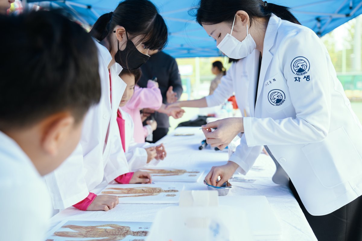 분당자생한방병원 의료진이 한의사 직업 체험 부스에 방문한 어린이들에게 침치료 실습을 진행하고 있다