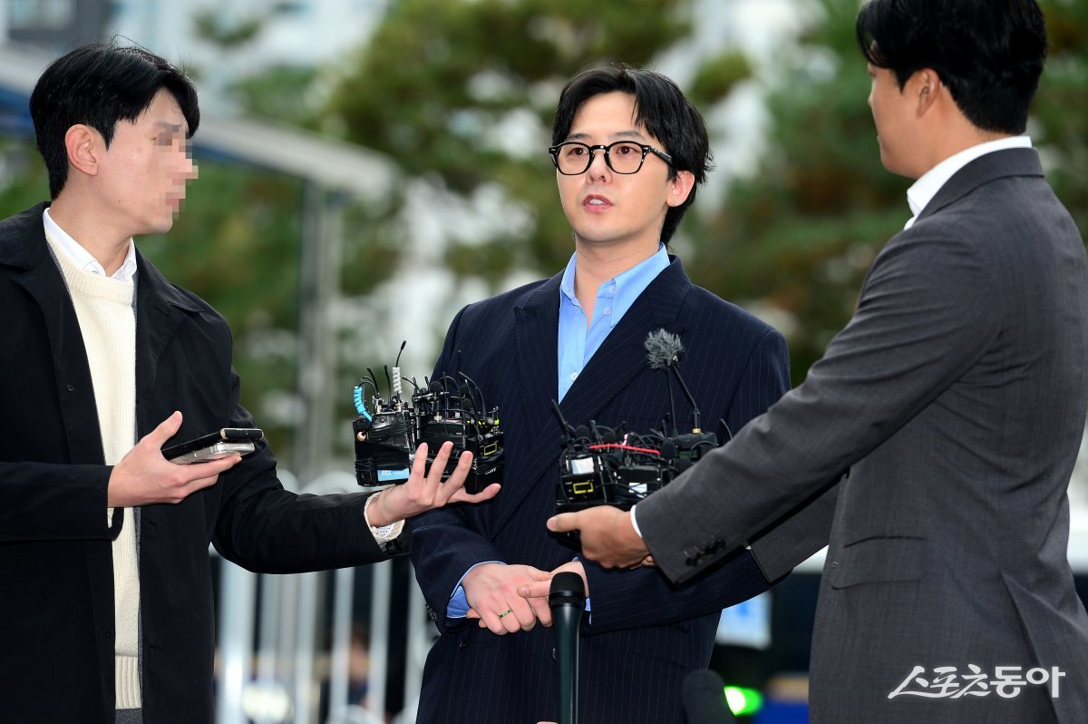 마약 투약 혐의를 받는 가수 지드래곤(본명 권지용)이 6일 인천 논현경찰서에 피의자 신분으로 출석해 취재진과 인터뷰를 하고 있다.