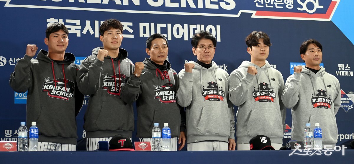 6일 서울 잠실야구장에서 열린 ‘2023 신한은행 SOL KBO리그’ LG 트윈스와 KT 위즈의 포스트시즌 한국시리즈 미디어데이에서 LG 오지환, 임찬규 염경엽 감독과 KT 이강철 감독, 박영현, 박경수가 기념촬영을 하고 있다.