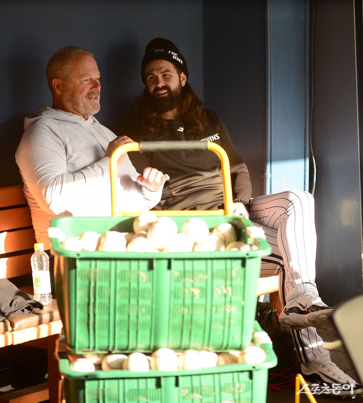 한국시리즈를 앞둔 LG 선수단이 6일 서울 잠실야구장에서 훈련을 가졌다. 켈리가 아버지와 이야기를 하고 있다.