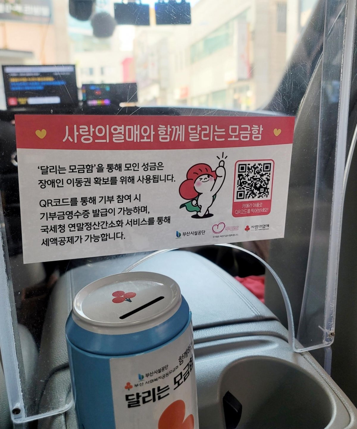 부산시설공단이 기부문화 확산을 위해 두리발 차량 내 ‘달리는 모금함’에 기존 저금통 형식과 함께 QR코드 기부방식을 추가해 운영하고 있다. 사진제공ㅣ부산시설공단