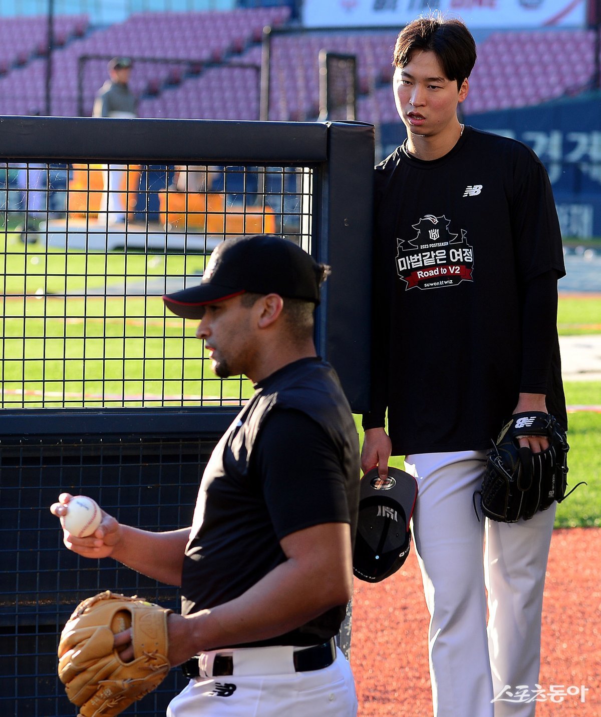 7일 서울 잠실야구장에서 ‘2023 신한은행 SOL KBO리그’ LG 트윈스와 kt 위즈의 한국시리즈 1차전 경기가 열린다. 경기 전 kt 엄상백이 쿠에바스의 투구를 바라보고 있다.