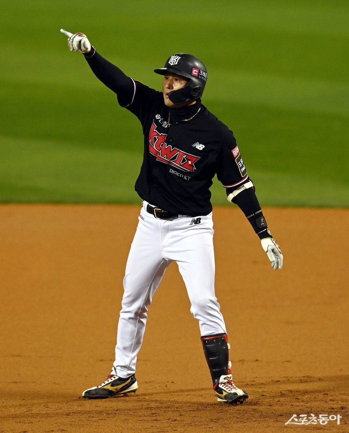 7일 서울 잠실야구장에서 ‘2023 신한은행 SOL KBO리그’ LG 트윈스와 kt 위즈의 한국시리즈 1차전 경기가 열렸다. 1회초 무사에서 kt 김상수가 안타를 날린 후 세리머니를 펼치고 있다.