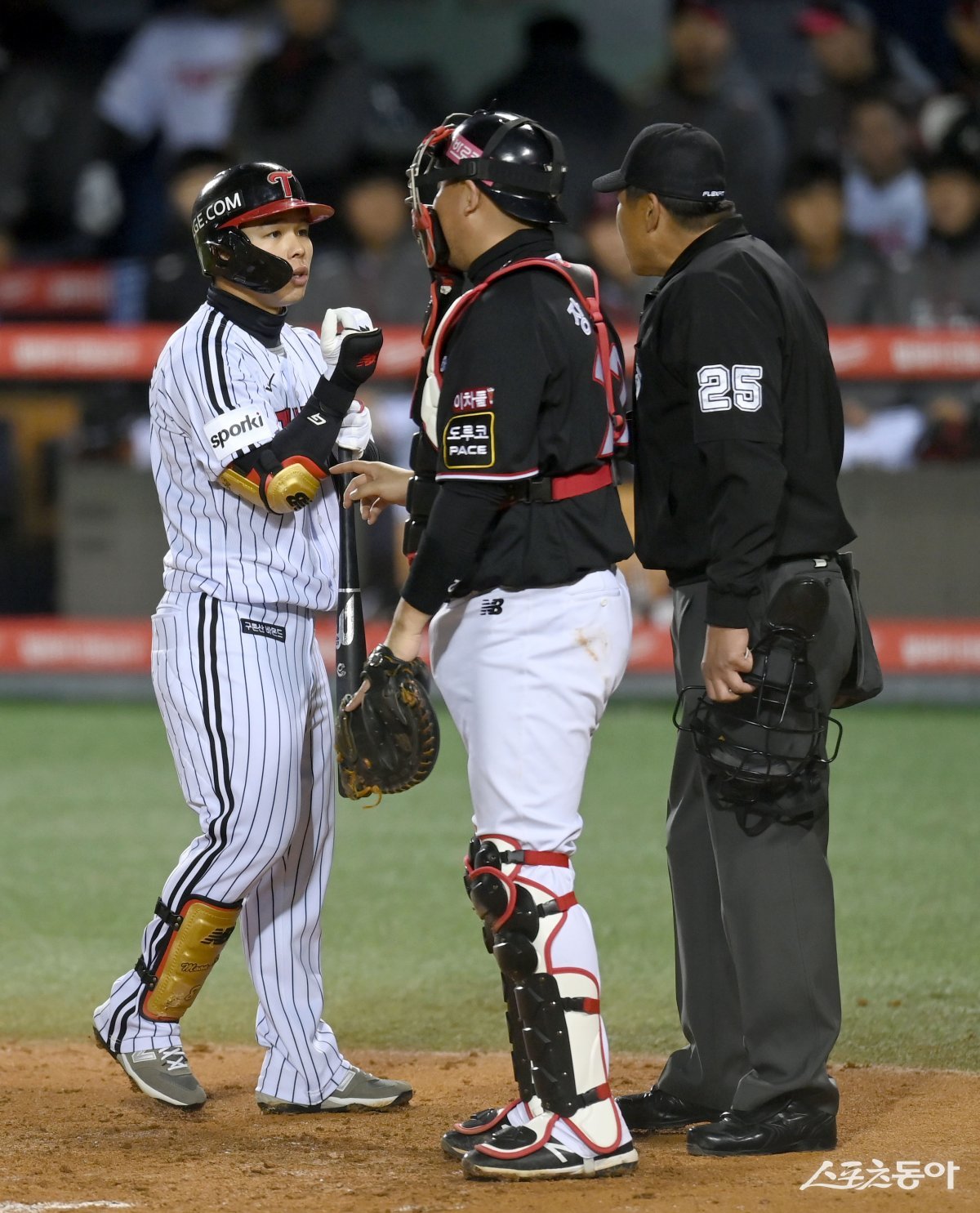 7일 서울 잠실야구장에서 ‘2023 신한은행 SOL KBO리그’ 포스트시즌 한국시리즈 1차전 KT 위즈와 LG 트윈스 경기가 열렸다. 4회말 무사 1루 LG 문성주가 공에 맞았다며 어필하고 있다.