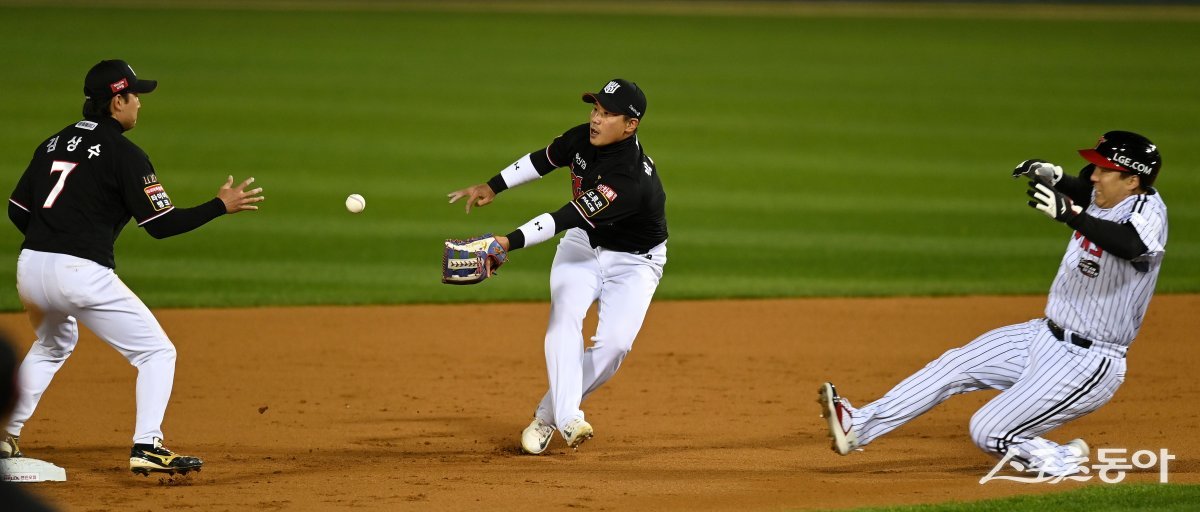 7일 서울 잠실야구장에서 ‘2023 신한은행 SOL KBO리그’ 포스트시즌 한국시리즈 1차전 KT 위즈와 LG 트윈스 경기가 열렸다. 1회말 1사 1,3루 LG 오스틴 내야 땅볼 때 KT 박경수가 송구 실책을 하고 있다.
