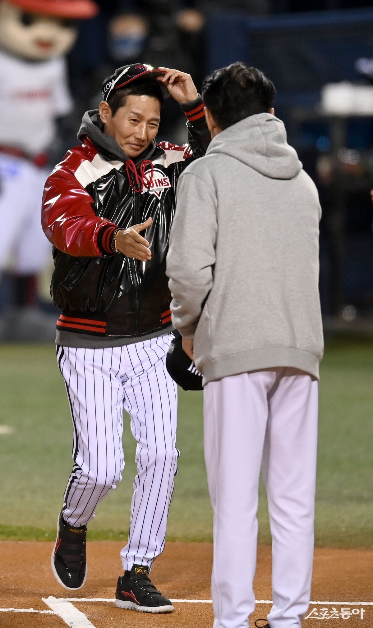 7일 서울 잠실야구장에서 ‘2023 신한은행 SOL KBO리그’ 포스트시즌 한국시리즈 1차전 KT 위즈와 LG 트윈스 경기가 열렸다. 식전행사에서 LG 염경엽 감독이 KT 이강철 감독과 인사하고 있다.