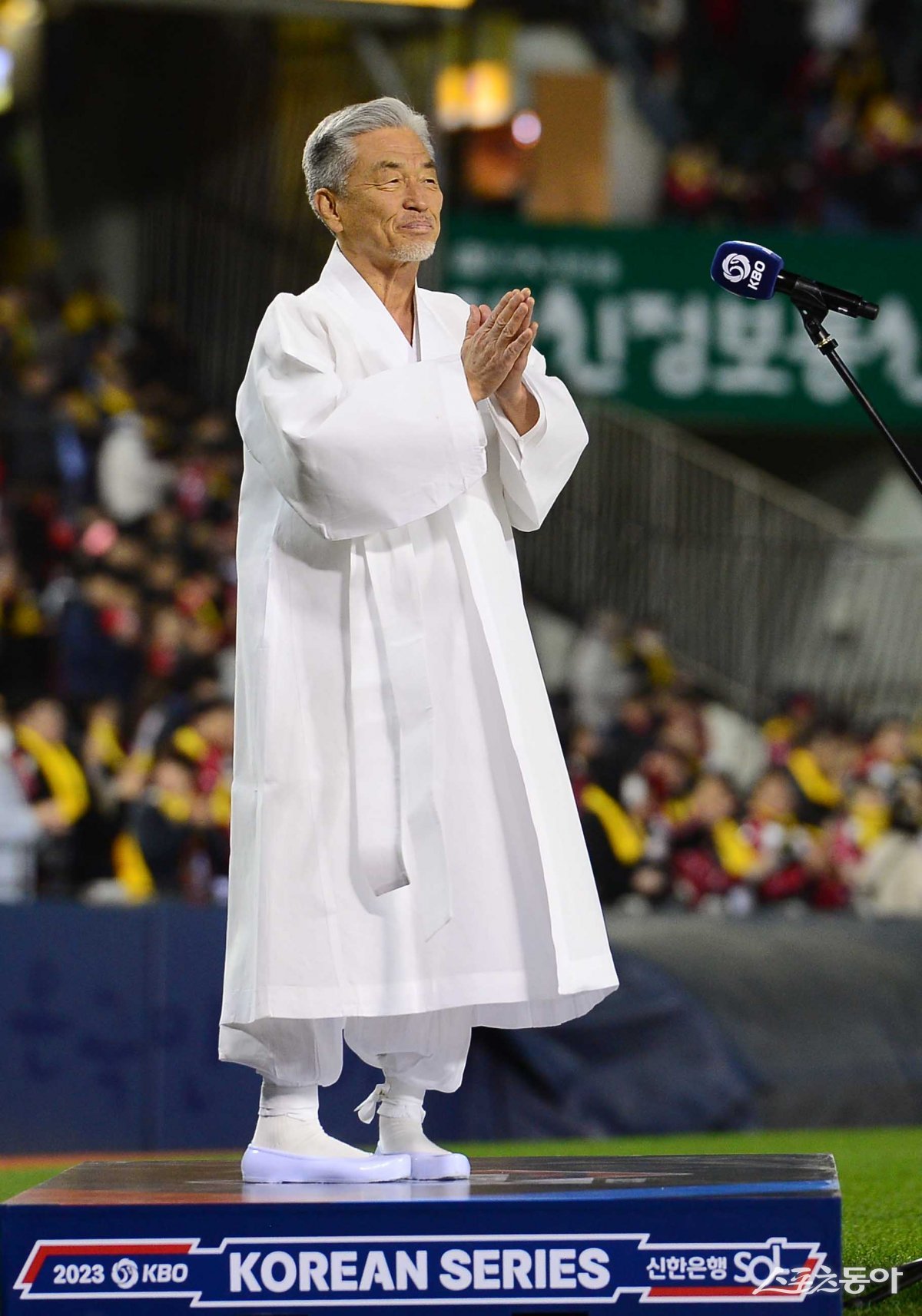 7일 서울 잠실야구장에서 열린 ‘2023 KBO 포스트시즌’ LG 트윈스와 KT 위즈의 한국시리즈 1차전 경기에 앞서 장사익 씨가 애국가 제창 후 인사하고 있다.