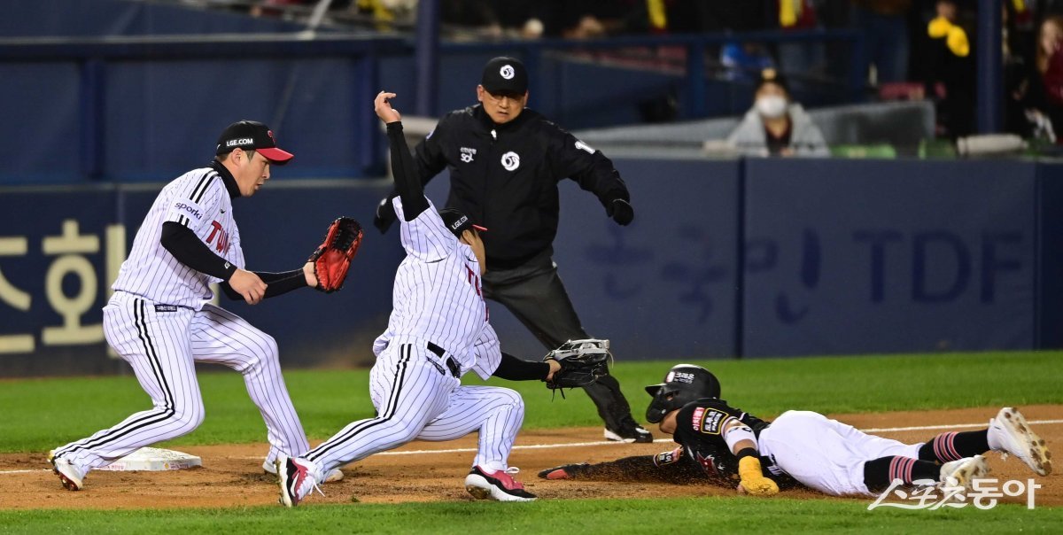 7일 서울 잠실야구장에서 열린 ‘2023 KBO 포스트시즌’ LG 트윈스와 KT 위즈의 한국시리즈 1차전 경기에서 2회초 무사 1, 2루 KT의 번트 때 LG 3루수 문보경이 1루주자를 태그 아웃시키고 있다.