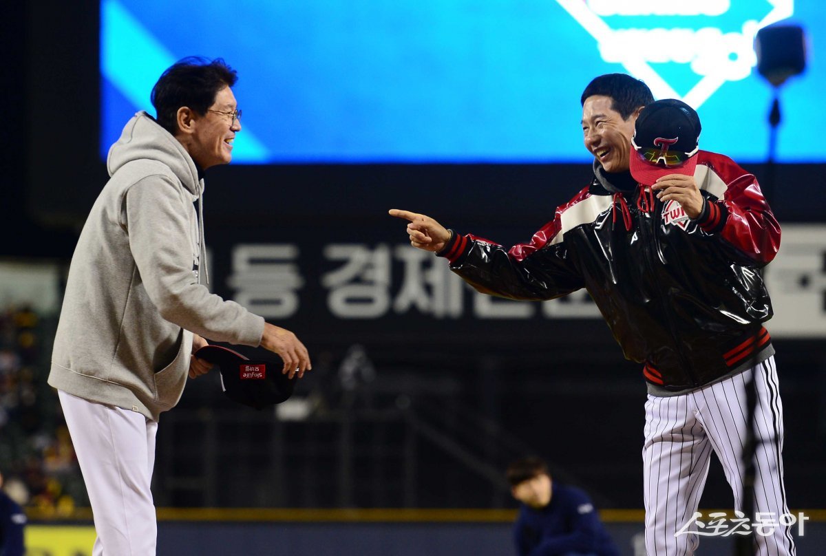 7일 서울 잠실야구장에서 열린 ‘2023 KBO 포스트시즌’ LG 트윈스와 KT 위즈의 한국시리즈 1차전 경기에 앞서 개막 행사에서 KT 이강철 감독과 LG 염경엽 감독이 인사하며 웃고 있다.