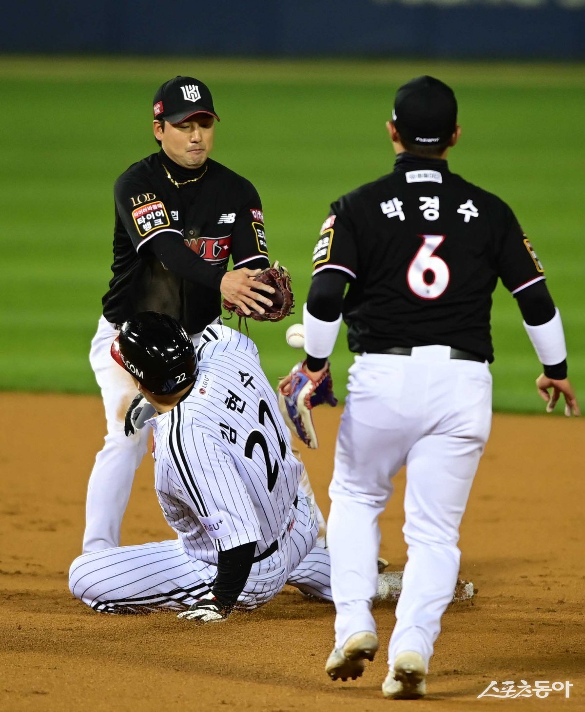 7일 서울 잠실야구장에서 열린 ‘2023 KBO 포스트시즌’ LG 트윈스와 KT 위즈의 한국시리즈 1차전 경기에서 1회말 1사 1, 3루 LG의 땅볼 때 KT 김상수가 박경수의 송구 실책으로 볼을 놓치고 있다.