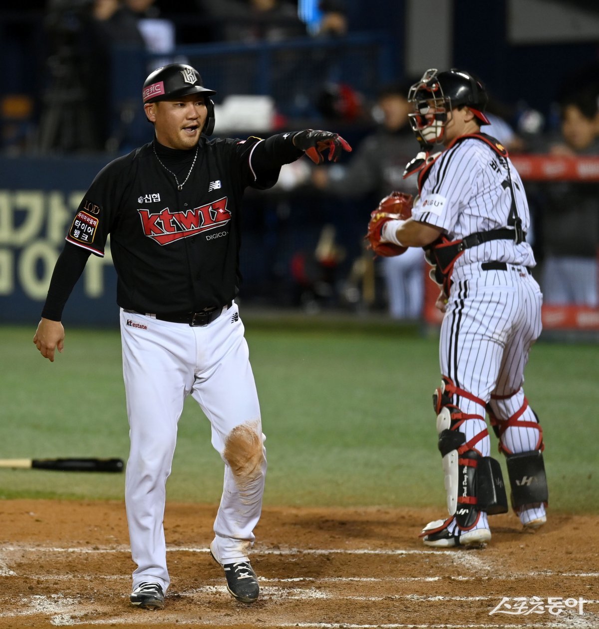 7일 서울 잠실야구장에서 ‘2023 신한은행 SOL KBO리그’ 포스트시즌 한국시리즈 1차전 KT 위즈와 LG 트윈스 경기가 열렸다. 7회초 2사 1,2루 KT 안타 때 2루주자 장성우가 홈까지 달렸으나 아웃 판정되자 비디오판독을 요청하고 있다.