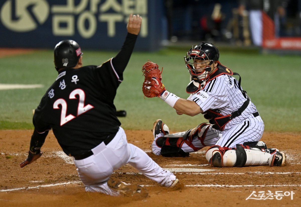 7일 서울 잠실야구장에서 ‘2023 신한은행 SOL KBO리그’ 포스트시즌 한국시리즈 1차전 KT 위즈와 LG 트윈스 경기가 열렸다. 7회초 2사 1,2루 KT 안타 때 2루주자 장성우가 홈까지 달렸으나 아웃되고 있다.